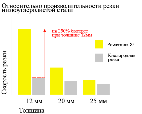 - Задания выполняются быстрее, поскольку скорость резки низкоуглеродистой стали толщиной 12 мм в полтора раза выше по сравнению с аналогичным показателем для кислородной резки
