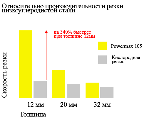 - Задания выполняются быстрее, поскольку скорость резки низкоуглеродистой стали толщиной 12 мм в три раза выше по сравнению с аналогичным показателем для кислородной резки